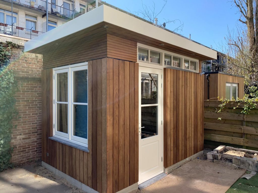 Voor een familie in een benedenwoning in Amsterdam wordt een Tiny House in Amsterdamse School stijl in de tuin geplaatst