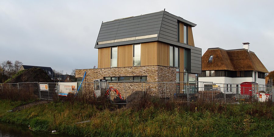 De kleuren van het grafiet grijze gepatineerde zink en het behandelde western red cedar van de bovenbouw komen in beeld.