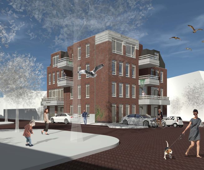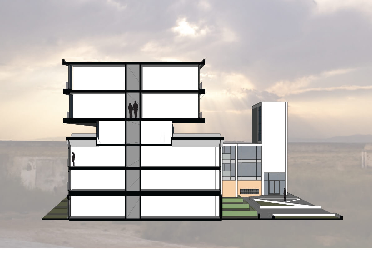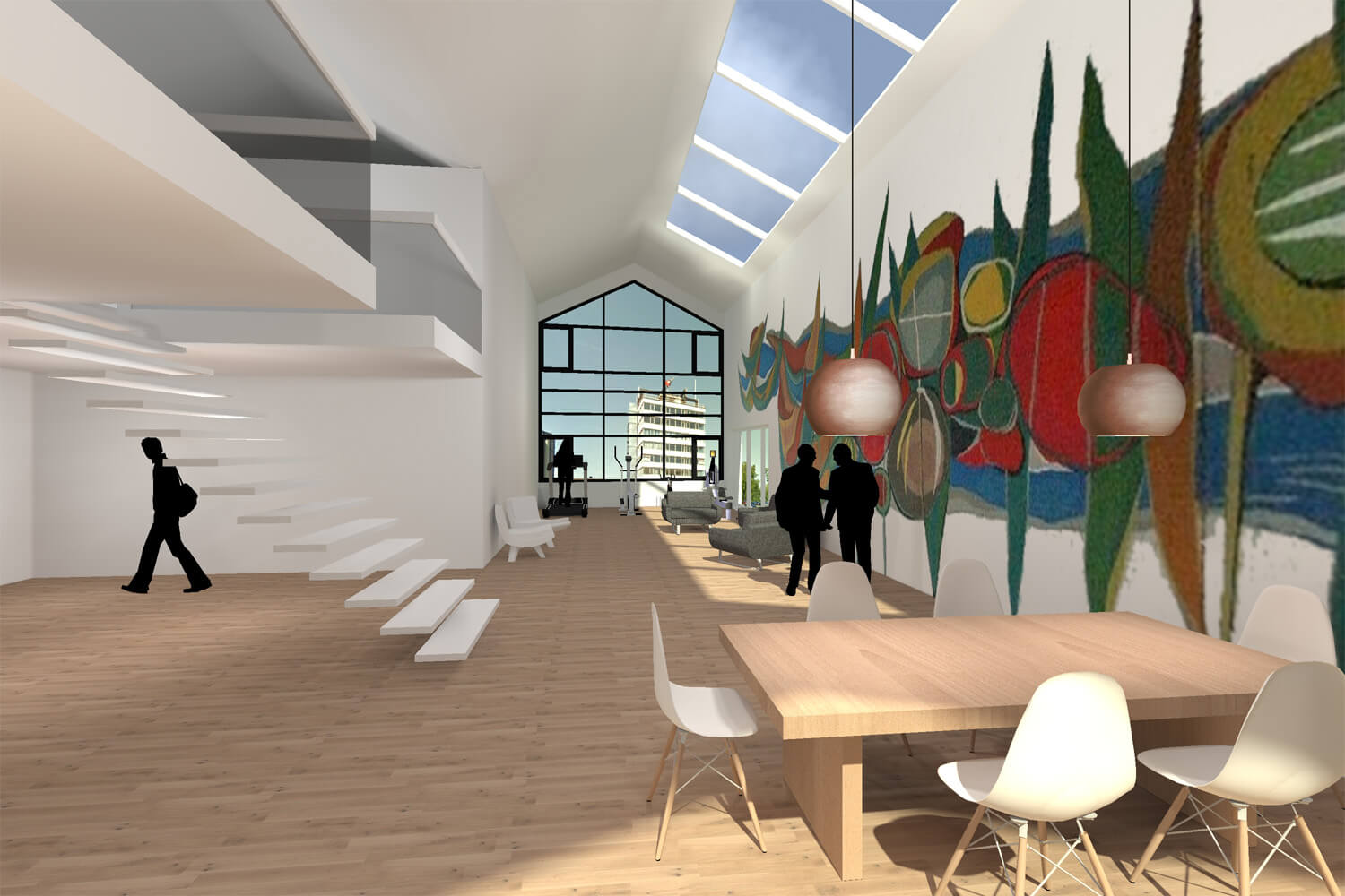 In opdracht van Pré Wonen hebben we een onderzoek gedaan naar de mogelijkheden om woningen te realiseren in de voormalige Aula van de Haarlemse School. Op basis van deze studie hebben we in samenwerking met Ecolodge het plan verder uitgewerkt. Met respect voor het pand en de bestaande kunstwerken kunnen hier 36 appartementen voor studenten/starters gerealiseerd worden. Er is een mooie gemeenschappelijke ruimte gemaakt langs het kunstwerk van Hans Wiesman. Optioneel kan er een opbouw gerealiseerd worden waar nog eens 12 loftwoningen in gerealiseerd kunnen worden met uitzicht over de stad.
