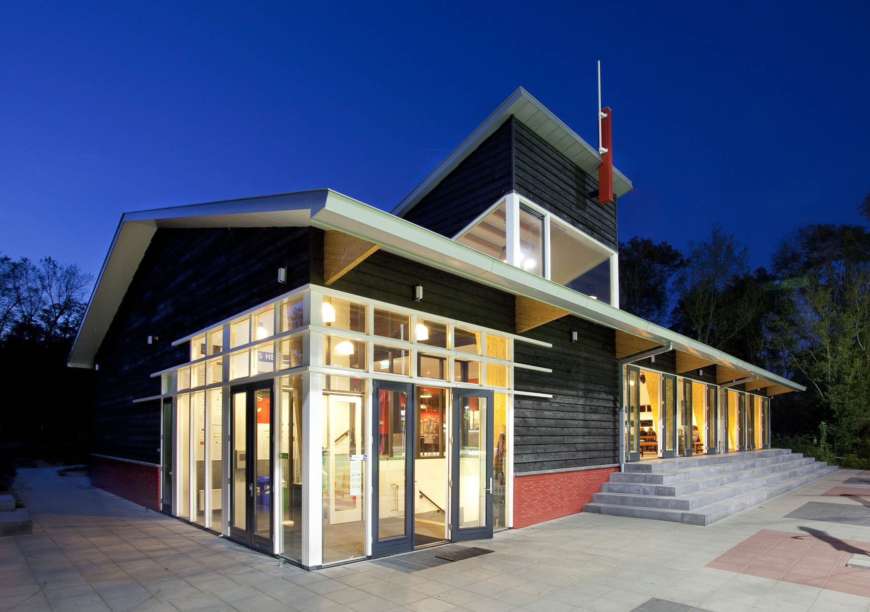 Aan de rand van de Kennemer duinen, tussen de bomen ligt het clubhuis van Mixed Hockeyclub HBS. Vanwege het niveauverschil zijn de kleedkamers half verdiept in het duin gelegd. Er ontstaat op een natuurlijke wijze een brede trap naar het terras die dienst doet als tribune voor het hoofdveld. De bestuurskamer bevindt zich in het torentje dat het zinken dakvlak doorbreekt.