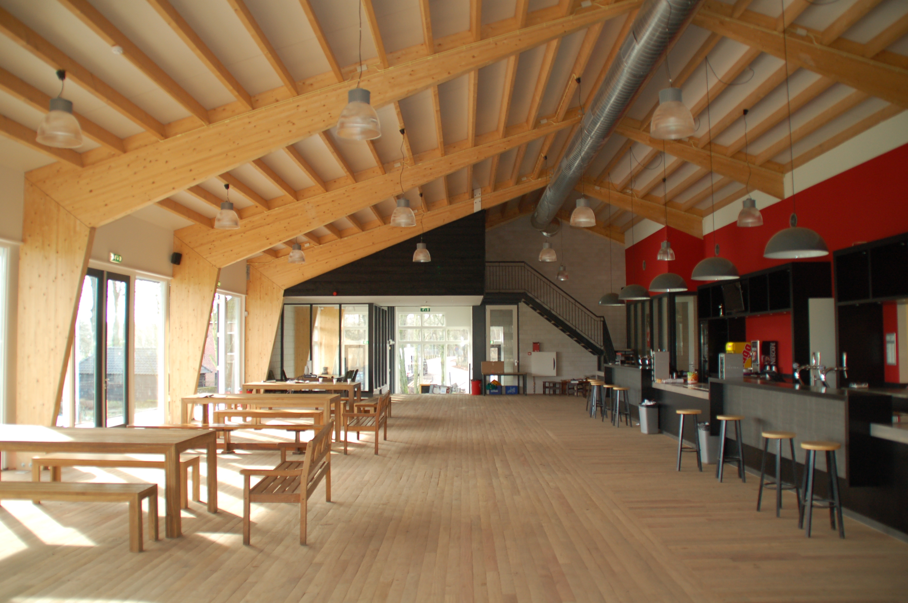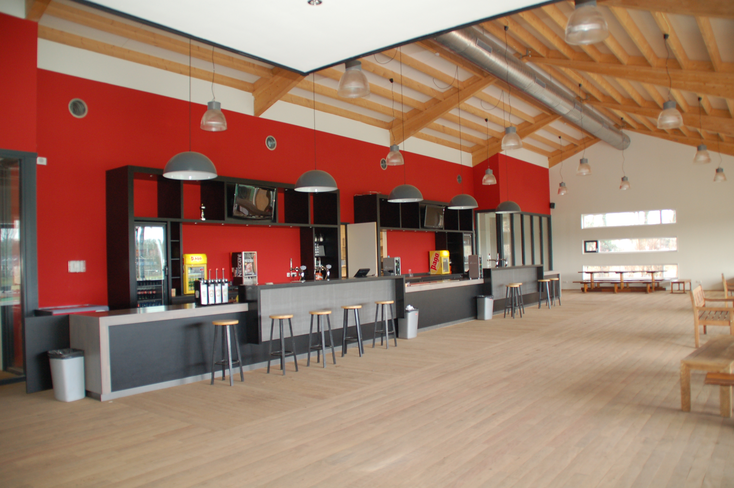 Binnen is een echte kroegvloer gecreëerd die samen met de houten spanten en de stoere monumentale bar van het nieuwe gebouw een echt HBS clubhuis maken.