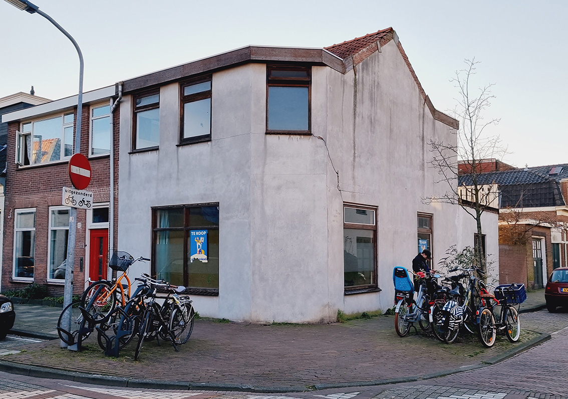 Aan de Brouwersstraat in de Leidsebuurt in Haarlem staat deze sterk verouderde hoekwoning. Er heeft funderingsherstel plaats gevonden en alleen het casco staat nog nog overeind.