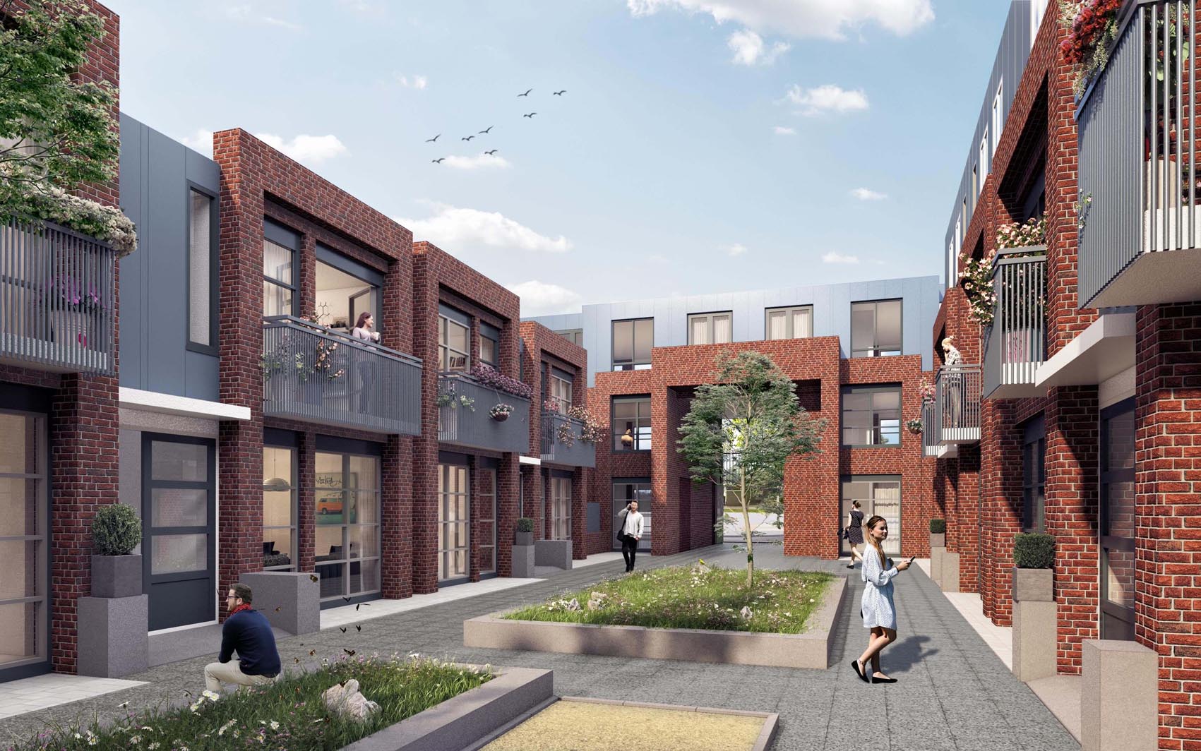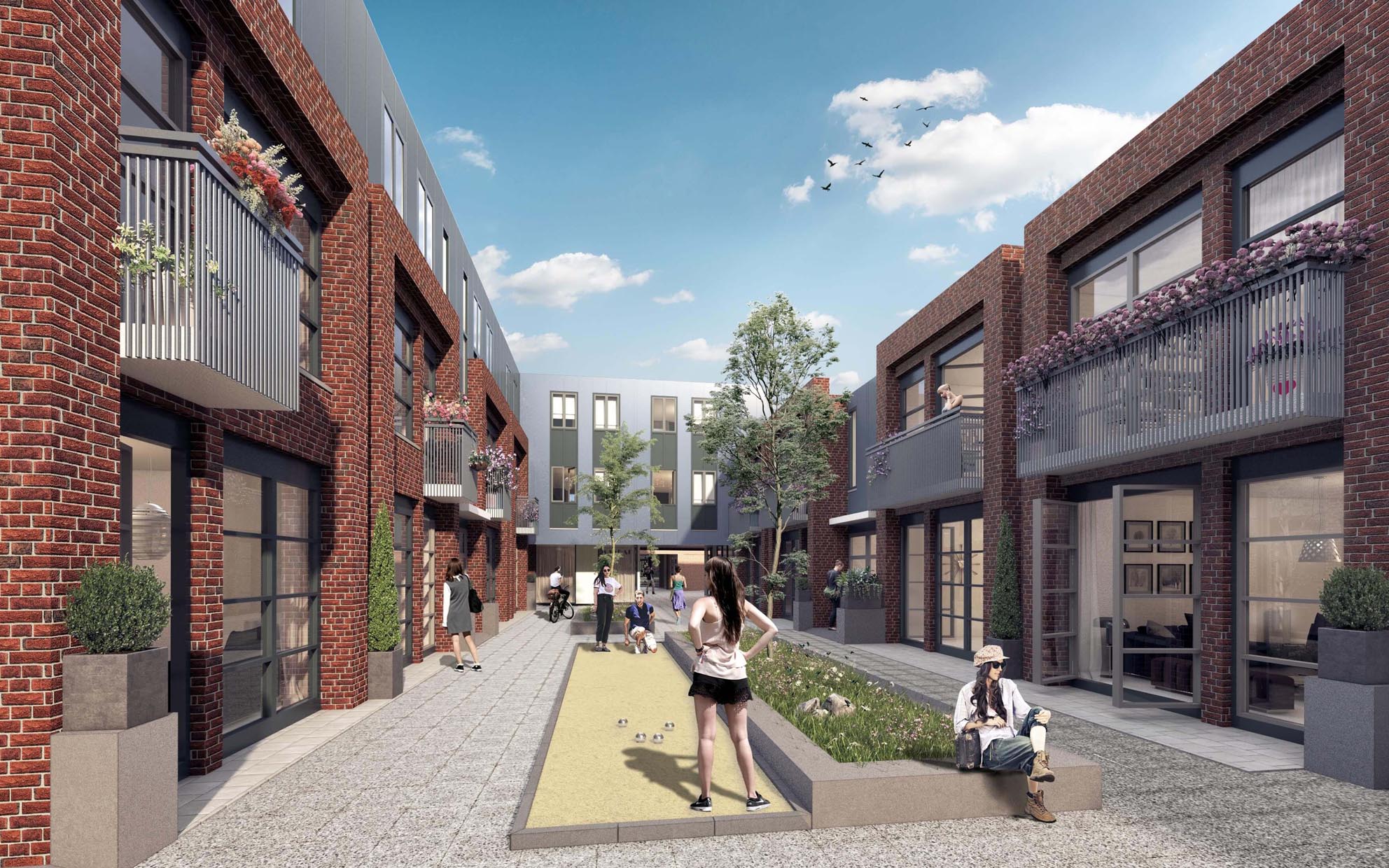 In de Slachthuisbuurt aan de rand van het centrum van Haarlem hebben wij een nieuw Haarlems Hofje ontworpen met binnenstedelijke kwaliteiten. In New Harlem komen 60 woningen voor jonge, creatieve starters op de woningmarkt. De appartementen zijn gesitueerd rondom een collectieve binnentuin met gezamenlijke voorzieningen zoals werkruimten, fietsenberging en elektrische auto’s worden gedeeld. Vanaf de hof ontsluiten ruime portieken 4 tot 6 woningen, die flexibel zijn in te delen door de bewoners.